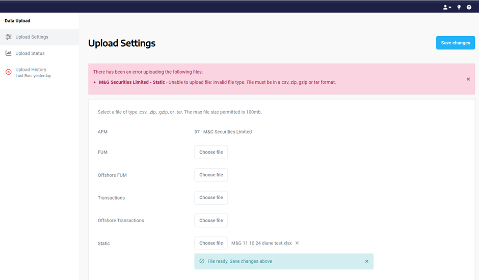 The acceptable downloads for annual static form are .xlsx as shown below, however uploading the same file in .xlsx produces an error message. See second screen shot for details. The upload process should accept file type .xlsx